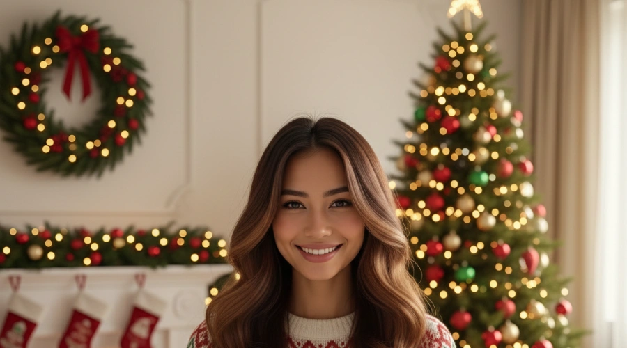 4. “Potret Natal estetik 2025, mengenakan sweater Natal, background ruang tamu elegan dengan perapian dan pohon Natal.”