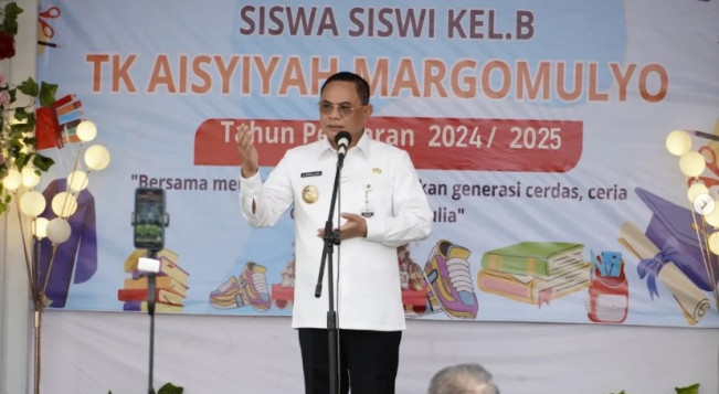 Bupati Pati Sudewo memberikan saat berpidato di acara wisuda siswa-siswi TK Aisyiyah Desa Margomulyo, Kecamatan Tayu, Pati, Rabu (18/6/2025). (Instagram @pemkabpati)