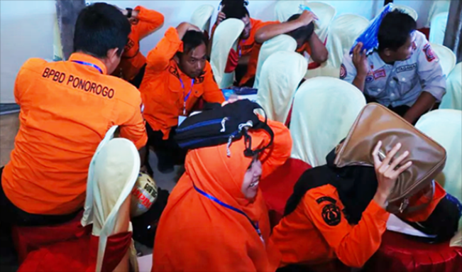 Simulasi gempa bumi saat Sekolah Lapang Gempa bumi dan Tsunami (SLG) 2025 di Kabupaten Ponorogo, Jawa Timur, Rabu (15/10/2025)/Foto: dok BMKG