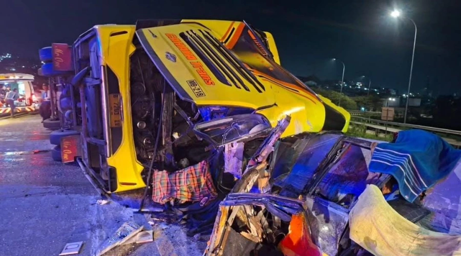 Bus diduga hilang kendali saat melaju kencang sehingga menabrak pembatas jalan dan akhirnya terguling.