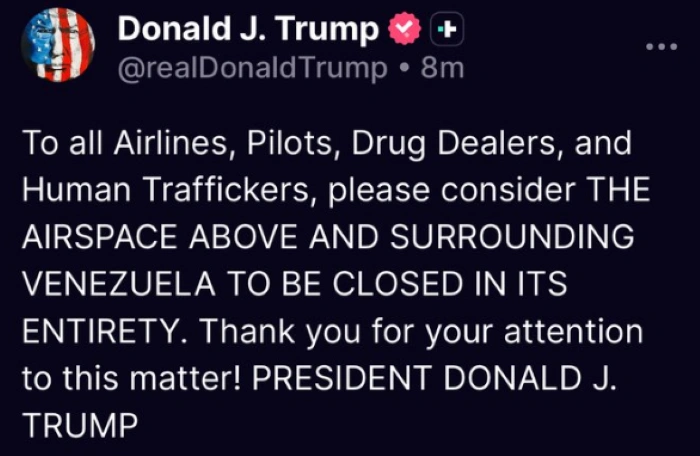 "Kepada seluruh Maskapai Penerbangan, Pilot, Pengedar Narkoba, dan Pedagang Manusia, mohon pertimbangkan bahwa WILAYAH UDARA DI ATAS DAN DI SEKITAR VENEZUELA UNTUK DITUTUP SELURUHNYA," tulisnya di platform Truth Social miliknya.