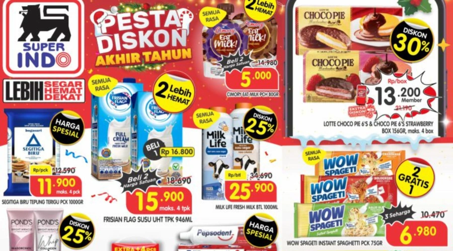 Promo Superindo 21 Desember 2025. [superindo.co.id]Promo Superindo 21 Desember 2025. [superindo.co.id]Sejumlah produk kebutuhan dapur mendapatkan harga spesial, seperti Segitiga Biru Tepung Terigu, Frisian Flag Susu UHT, serta Milk Life Fresh Milk yang didiskon hingga 25 persen. Produk instan dan camilan juga ikut dipromosikan, termasuk Wow Spageti Instant dan Lotte Choco Pie dengan potongan hingga 30 persen untuk member.