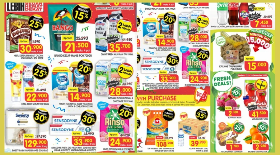 Promo Superindo 30 Desember 2025. [superindo.co.id]Untuk kategori makanan dan minuman kemasan, sejumlah produk favorit mendapatkan diskon besar seperti Nestle Koko Krunch yang turun 25 persen dan Bango Kecap Manis dengan potongan 15 persen. Minuman keluarga seperti Cimory Fresh Milk, Indomilk UHT, serta Sprite, Coca-Cola, dan Fanta juga hadir dengan promo beli lebih hemat.