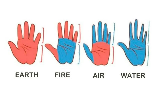 Bentuk tangan mewakili salah satu dari empat elemen alam: udara, air, api, dan tanah. Bentuk tangan menentukan kepribadian dan kemampuan yang dimiliki seseorang.