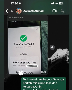 Chika Jessica pun turut membagikan foto bukti transfer dari Raffi Ahmad yang diperkirakan puluhan juta rupiah. Tak hanya mengucapkan terima kasih, ia juga mendoakan Raffi Ahmad sekeluarga agar selalu diberkahi Allah SWT.