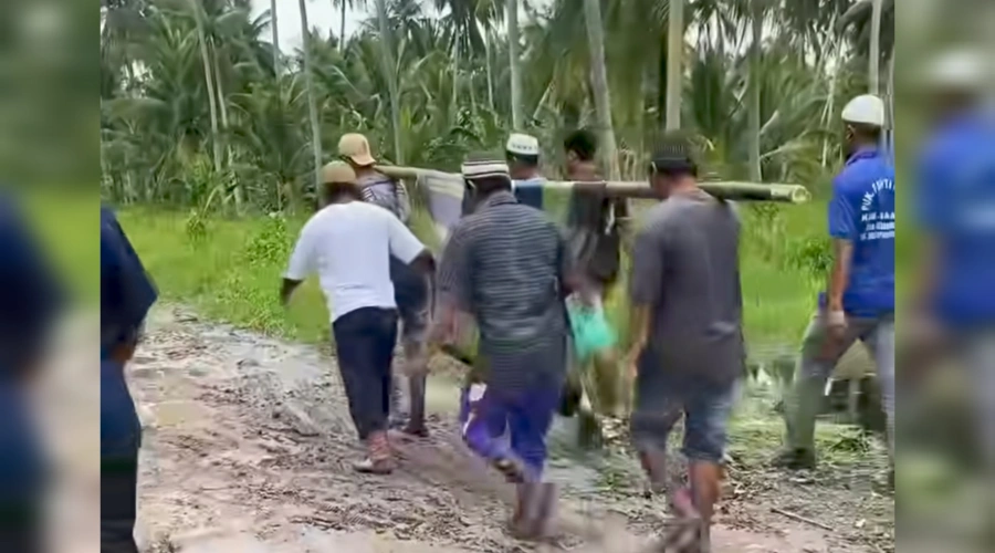 Kondisi jalan yang rusak parah dan berlumpur yang tidak dapat dilalui kendaraan bermotor, termasuk mobil ambulans, sehingga warga terpaksa menggotong jenazah.