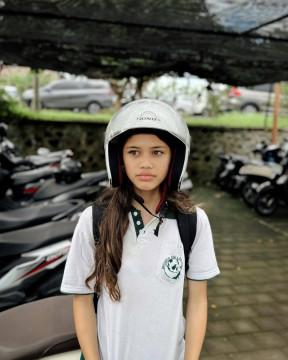 2.Ia juga mengunggah foto Sarah saat memakai baju sekolah dan menggunakan helm hendak ingin naik ke motor. Menrut Andrew White, foto ini diambil sebelum Sarah marah dengannya. "Slide 2: pas jemput dan blom marah2 ama bapaknya," kata Andrew White.